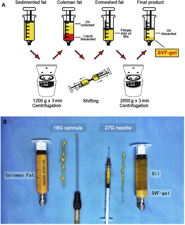Stromal vascular fraction gel (SVF-gel) is prepared by a series of mechanical processes, including centrifugation and intersyringe shifting.