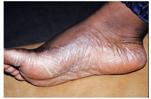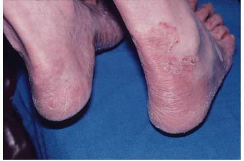 The skin of the entire sole, sides of the foot, and heel is scaly, appears to be “dry,” but not inflamed (Fig. 19-3)