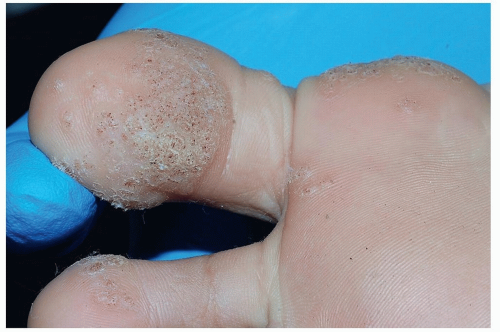 Scale, maceration, and fissures of toe webs are characteristic, especially between the fourth and fifth toes (Fig. 19-1); however, any web space, as well as the dorsal foot may be involved