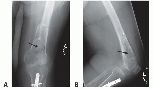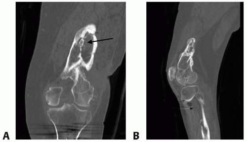 FIG 2 • A. Coronal and sagittal (B) CT scan of the distal femur with chronic osteomyelitis demonstrating sclerotic rim of the bone (involucrum) surrounding a spicule of the bone (sequestrum, arrow).