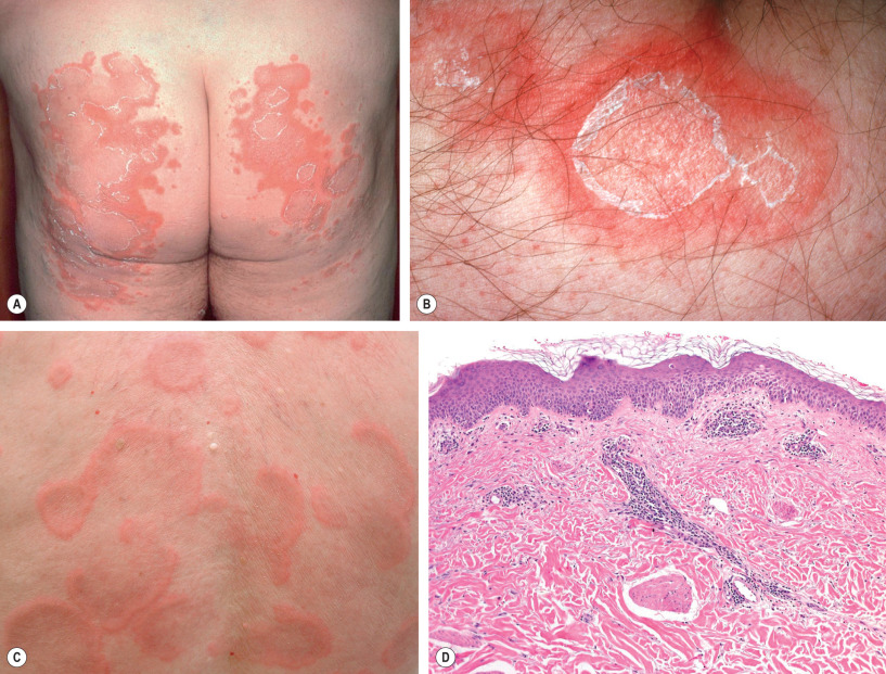 The initial lesions of EAC begin as firm pink papules that expand centrifugally and then develop central clearing. An individual lesion can enlarge to greater than 6 cm in diameter over a period of 1 to 2 weeks. If expansion of the annular plaque is not uniform, incomplete arcs appear, as do polycyclic lesions, or simply festooned bands. In the superficial form, the lesions are minimally elevated, and there is desquamation at the inner margin, i.e. trailing scale ( Fig. 19.1A,B ). The scale may not be present in all the lesions in a particular patient ( Fig. 19.2A ). There may be associated pruritus, especially in lesions that histologically show spongiosis. Occasionally, vesicles develop within the peripheral margin. In deep gyrate erythema, the advancing edges are obviously elevated ( Fig. 19.1C ) and there is usually no associated scale or pruritus.