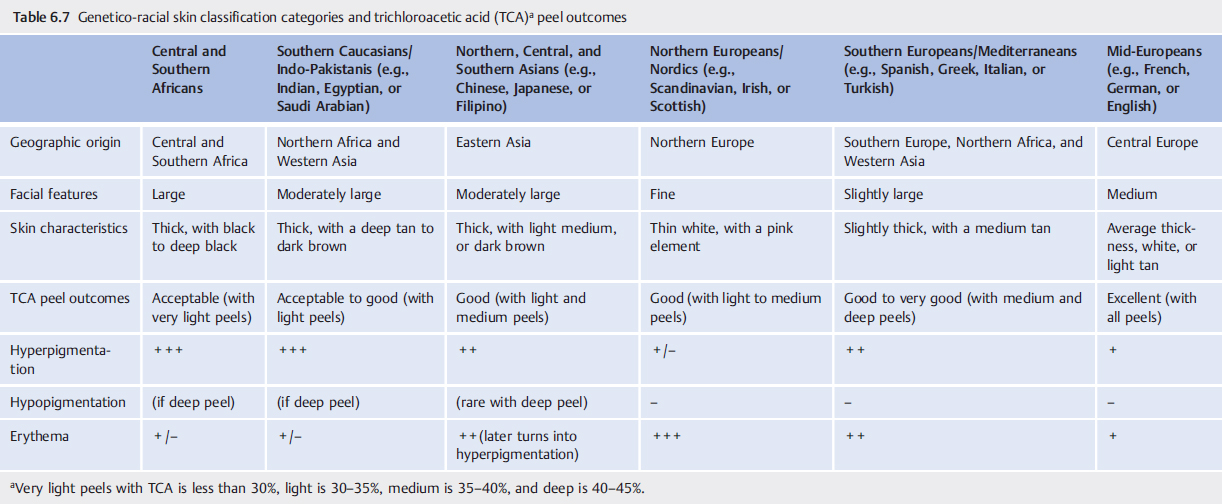 Skin type assessment is an integral part of the prepeel consultation. Common classification has been primarily based on degree of skin pigmentation and tanning/burning susceptibility. However, more reliable skin type classification for chemical peeling has been proposed by Fanous and Zari that utilizes a genetico-racial category (Table 6.7).22 Inhabitants from the three ancient continents—Europe, Africa, and Asia—exhibit predictably lighter, thinner skin and smaller features as one moves north, and gradually display darker, thicker skin with larger features as one moves south. In this classification, Europe and Africa run in a parallel vertical fashion to Asia and is divided into six total categories. By using this genetico-racial classification, peel outcomes can be reliably predicted, and complications are more likely to be prevented. For example, despite their Fitzpatrick phototype, it may not be advisable to proceed with a deep peel in Nordics (e.g., Scandinavian, Irish, or Scottish) as their thin skin may make them prone to scarring. A useful peeling guideline that incorporates this genetico-racial classification is as follows: (1) medium to deep peels for mid-Europeans and southern Europeans (Mediterraneans), (2) medium and light to medium peels for northern Europeans (Nordics) and Asians, (3) light peels for southern Caucasians (Indo-Pakistanis), and (4) very light peels for Africans.