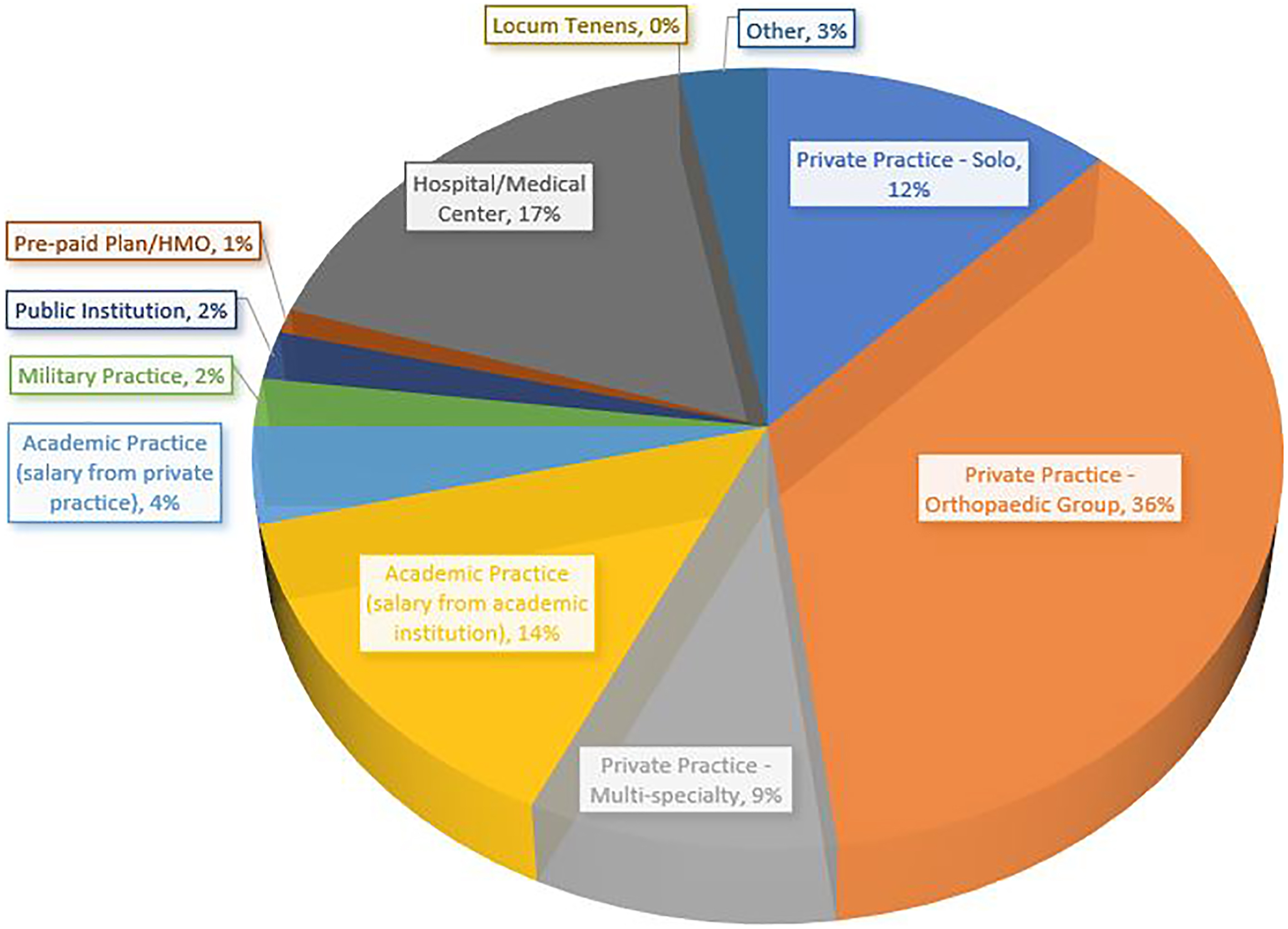 What draws you toward the private practice model? According to the 2018 AAOS census data, 57.2% of practitioners entering the work force were in some form of private practice model ( Fig. 1 ). Orthopedic group private practice comprised 65% while multispecialty and solo practices made up 20% and 15% of the model, respectively. The last two are roughly equivalent to those in academic practice (18% total). The benefits of private practice are vast, but autonomy tends to be a common reason for entering into the model. Having the say over your own schedule, while controlling the volume and types of patients you would like to treat is a decision you will get to make. You can take vacation without approval or time limitations and plan your work schedule to fit your personal needs.