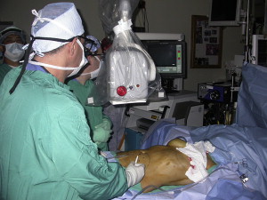 Fluorescent laser angiography in use during perforator flap surgery. The camera is sterilely draped into the field to be directly manipulated by the operating surgeon.