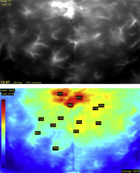 Once the surgeon is ready to image, the camera is positioned and anesthesia gives a 5-mL bolus containing 2.5 mg ICG. No toxicity has been seen with total doses of 5 g/kg (400 mg in an 80-kg patient). Typical acquisition times are around 1 minute. If one is attempting to visualize and localize perforating blood vessels, the camera is turned on immediately to record the first blush. If perfusion is the goal, the camera is switched on 15 seconds after injection to maximize time for full tissue evaluation. As technology progresses these parameters may change, so one must check this with the particular vendor. If a second scan is desired, one should wait 5 minutes to allow washout of the ICG for optimal scanning. Some software development is under way to eliminate this wait by subtracting any background ICG still present. Current software, such as the SPY-Q (Novadaq/LifeCell) allows the data to be seen with colorimetric analysis for easier interpretation ( Fig. 2 ). This software can analyze data and plot areas of maximal intensity, which correlates with best perfusion or perforator location.