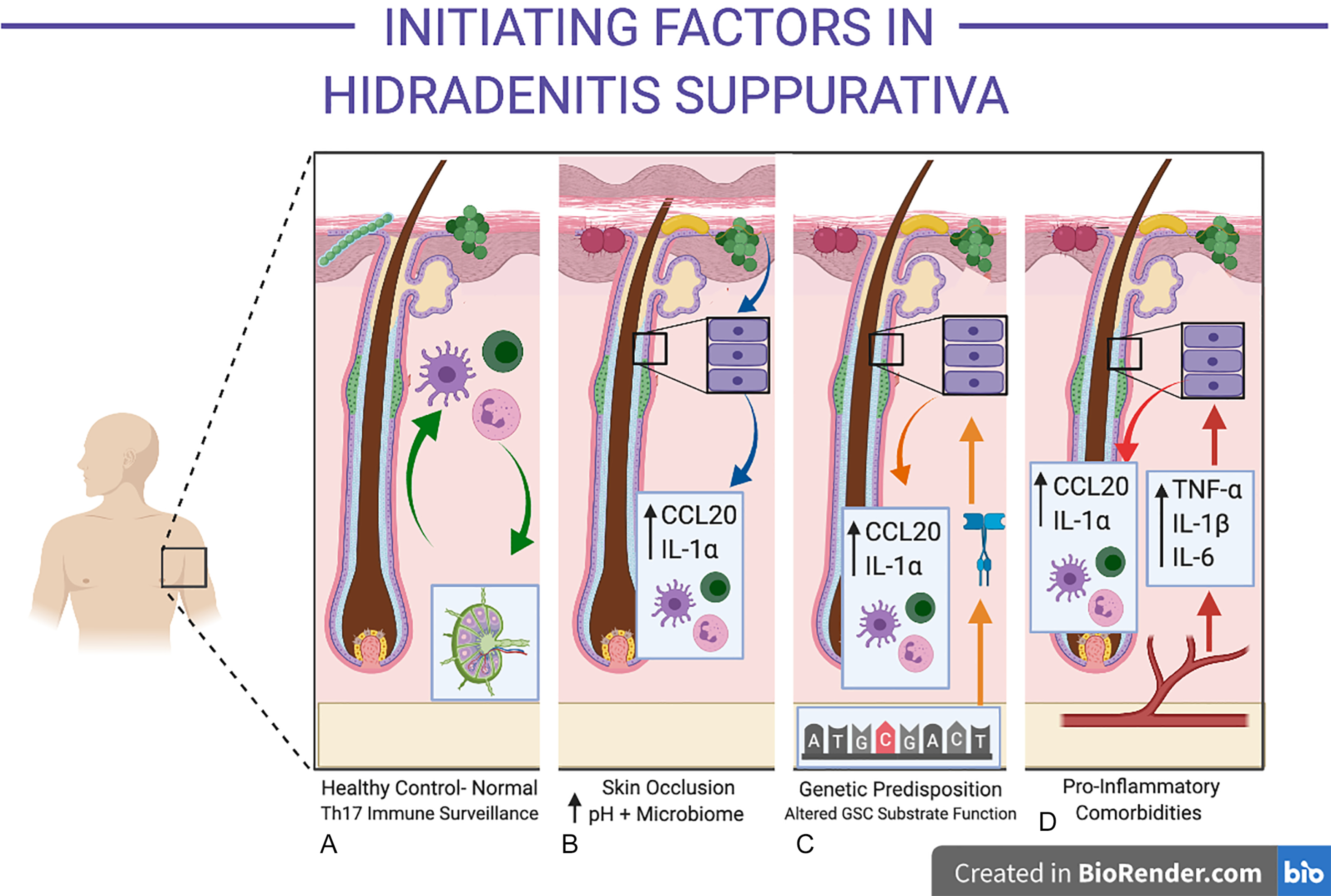 The follicular infundibulum is an immunologically active, microbially colonized site, involved in the development of immune tolerance to commensal organisms. This differs substantially from other portions of the follicle (such as the bulb), which are considered immunologically privileged sites. Infundibular keratinocytes produce CCL20 and antimicrobial peptides under normal physiological conditions. Increasing moisture decreases the pH of the stratum corneum and pH reductions are known to promote the colonization and activity of porphyromonas sp (a well-documented microbiont-associated with HS). Other bacterial species including Staphylococcus aureus Propionibacterium acnes, yeasts, and their associated proteins (including lipoteichoic acid) are able to induce the release of pre-formed IL-1α in keratinocytes. Indirect evidence for the role of yeasts in inflammatory activity in HS is demonstrated in recent observational studies of anti- Saccharomyces cerevisae antibodies in severe HS, which can also cross-react to other fungal and bacterial species. While the precise mechanisms of specific microbiological species and/or strains in HS are ill-defined, their functional role in producing an aberrant pro-inflammatory response (either directly or indirectly via keratinocytes) is consistent with observational studies identifying these microbionts in both early and advanced disease.