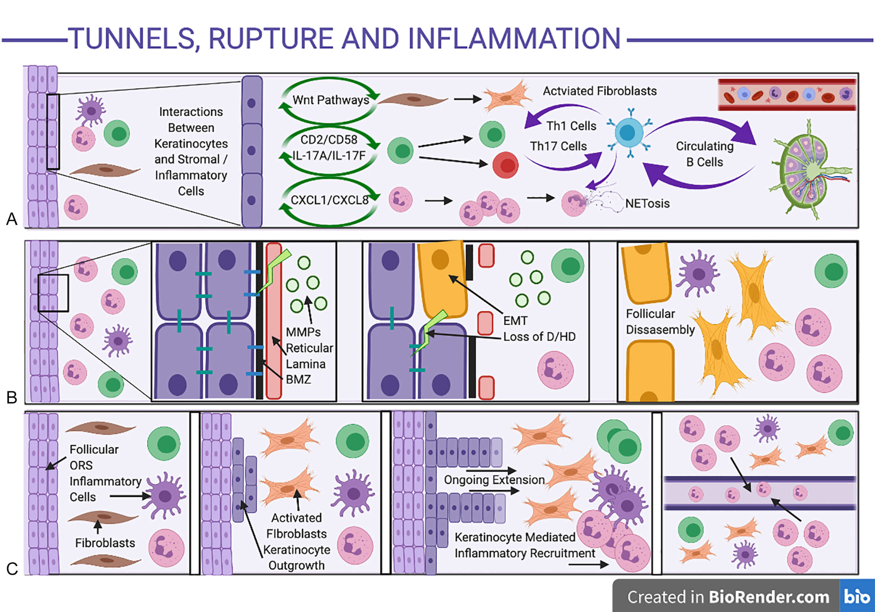 The inflammatory signature of established HS has been well characterized in multiple histological and molecular studies. Similarities and parallels with psoriasis have been observed in lesional and perilesional HS tissue, with lesional nodules demonstrating mixed inflammatory infiltrates comprising of T cell, dendritic cells, plasma cells, neutrophils, and monocytes. Chronic longstanding disease also demonstrates B cell infiltrates, NETosis, and development of epithelialized tunnels. An issue with understanding the characteristics of inflammation in HS is that the majority of specimens isolated for studies are from those with severe, longstanding disease. Hence, we have limited insight into the initiating events in early and/or mild HS. Additionally, until recently, there were no standardized, defined biopsy sites for investigational studies. Given that HS is morphologically diverse, it would be erroneous to assume that a biopsy from one portion of tissue is representative of all the different epidermal (and deep dermal) morphologies present across the spectrum of HS. Therefore, studies which do not define the severity, treatments, sites, and lesion types of biopsies should be interpreted with caution.