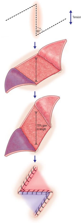 Release of scar contracture with local tissue rearrangement is a pillar of operative management. This technique utilizes local tissue to lengthen and disrupt symptomatic scars. One highly utilized technique is the versatile Z-plasty technique, which uses equilateral triangles of 60-degree angles to lengthen and disrupt the scar ( Fig. 4.10.6 ). Variations of this technique may be used by customizing the angles and the number of interposed flaps to the contour of the scar. Furthermore, the depth at which the flap is taken can be varied, depending on importance of the structures requiring soft tissue coverage. For example, fasciocutaneous Z-plasty flaps may offer more robust coverage over the ankle and its surrounding critical structures.