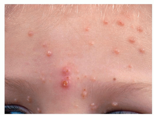 Often involves the face, forehead, eyelids (see Fig. 4-3), conjunctiva, as well as intertriginous areas such as the axillae and inguinal creases