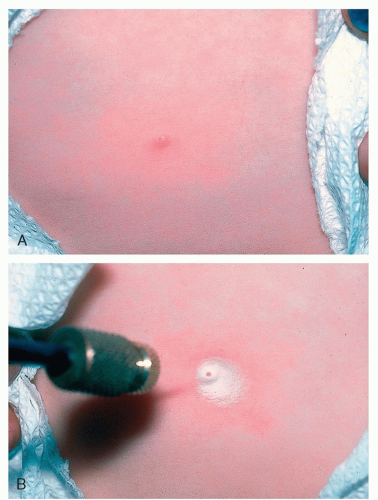 ![]() Figure 3-2 Molluscum contagiosum. A, Molluscum contagiosum. B, Molluscum contagiosum; A short application of LN2 accentuates the central core. |