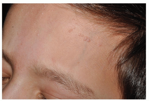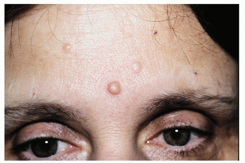 Small, flat-topped (planar), slightly elevated, skin-colored or tan papules, 1 to 3 mm in diameter (Fig. 3-3)