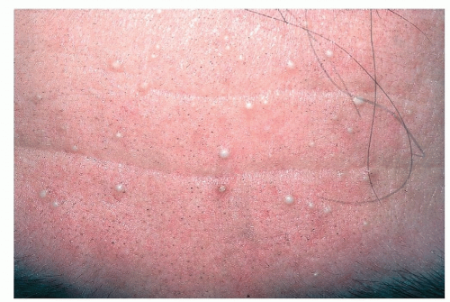 1.0 to 2.0 mm in diameter and are white to yellowish asymptomatic papules (Fig. 3-4)