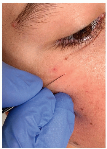 Incision and evacuation: In contrast to closed comedones (“whiteheads,” which they resemble), milia must first be incised (usually with a No. 11 blade or 20-gauge needle) before their contents can be easily expressed (Fig. 3-5).