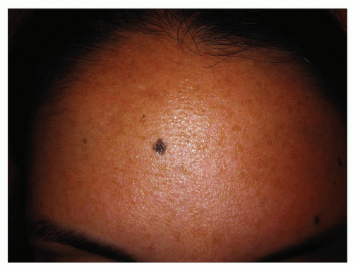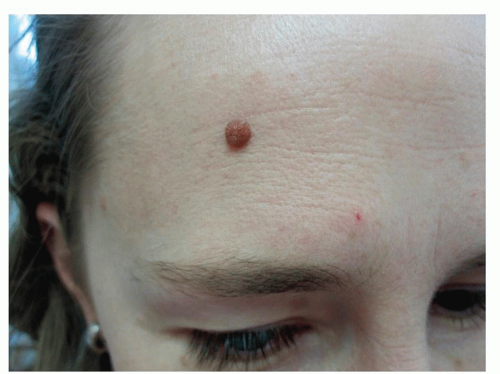 Elevated, dome-shaped papules or papillomatous nodules that are uniformly brown to dark brown (Fig. 3-7); may contain hairs