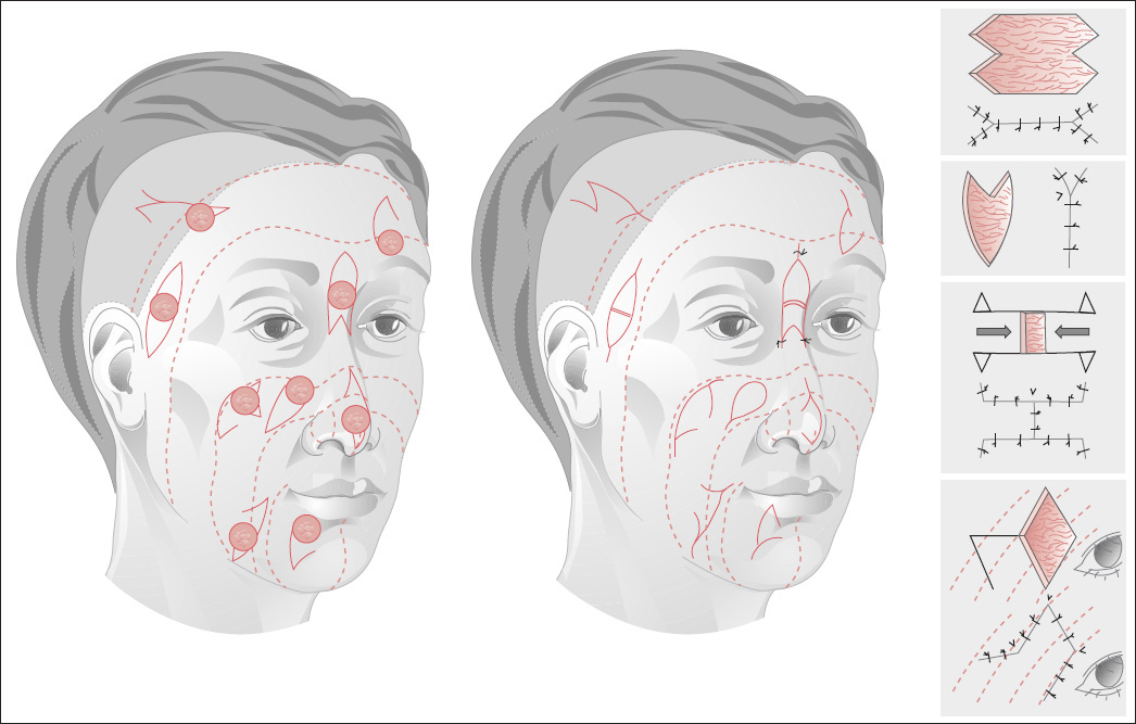 Small facial defects can be excised and reconstructed with small flaps using a technique that will place the scars as close to the RSTLs as possible (see Fig. 2.8a and Plate 1 ).
