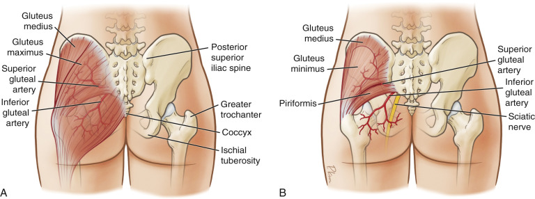 The superior gluteal artery arises from the internal iliac artery and exits through the greater sciatic foramen, above the piriformis muscle perforating the gluteus maximus muscle to supply the overlying skin and fat. The exit point corresponds anatomically to 6 cm below the posterior superior iliac spine and 4.5 cm lateral to the midline of the sacrum. The inferior gluteal artery also arises from the internal iliac artery and along with the sciatic nerve and emerges below the piriformis muscle ( Fig. 5.3 ).