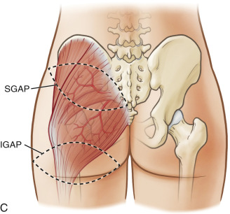 Typical skin paddles range from 6–10 cm in width by 18–22 cm in length. It is incumbent on the surgeon to resect a skin island that will facilitate a tension-free closure. A patient’s preference towards a superior or inferior flap is influenced by the advantages and disadvantages of each gluteal flap procedure. Anatomic considerations are based on a patient’s distribution of fat on the buttock and location of the most favorable vessels in the buttock.