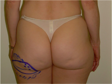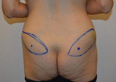 In an IGAP flap, the skin island is elliptical, and the inferior border of the flap should be parallel and placed about 1 cm inferior to the gluteal fold. The fold should be identified with the patient in a standing position. The flap design could be shifted laterally to address “saddlebag” deformities if needed. The scar from an inferior gluteal flap is located in a less prominent area of the buttock in the inferior gluteal crease and can be hidden. The scar is typically visible lateral to the buttock crease, and the natural curve of the inferior buttock crease can be unfavorably flattened ( Fig. 5.5 ).