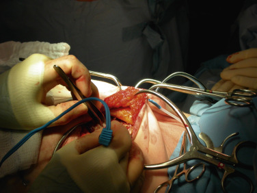 The most commonly used recipient vessels are the internal mammary vessels, which run parallel to the sternum, under the ribs ( Fig. 5.7 ). The muscle fibers of the pectoralis muscle are separated at the intercostal space between the second and third or third and fourth ribs. The perichondrium is elevated off the most medial portion of the ribs and the most medial section of the intercostal muscle is resected. A pale yellow layer of fat containing the internal mammary vessels is located under the intercostal muscle and over the pleura. The internal mammary artery is accompanied by one or two veins. The vessels are carefully dissected from the surrounding fat using a bipolar cautery. Side branches of the vein are preserved distally to create a wider lumen in case of size mismatch with the gluteal vein. An intercostal space of 2–3 cm is sufficient to perform the anastomosis. If more space is required, a portion of medial rib cartilage can be removed. The arterial size match is usually favorable if the GAP pedicle dissection was pursued all the way to the source vessel (SGA or IGA). If the pedicle was harvested prior to the larger artery, the pedicle vessel may be of smaller diameter. In this case, a better arterial size match may be achieved by using a perforating artery or a branch off of the internal mammary artery.