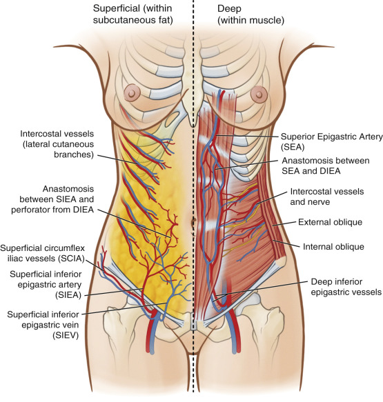 After piercing the deep fascia, the artery travels deep to the cribriform fascia in the superolateral portion of the femoral triangle, piercing the fascia to cross the inguinal ligament at its midway point lying deep to Scarpa’s fascia. Well above the inguinal ligament, the vessel penetrates Scarpa’s fascia to lie in the superficial subcutaneous tissue. Here it runs superomedially toward the periumbilical region progressively more superficial to anastomose with the ipsilateral medial and lateral perforating arteries from the DIEA through the subdermal plexus. Probably due to its lateral nature, perfusion studies have indicated the SIEA acts similarly to lateral row DIEP vessels, without blood flow crossing the midline. In patients with adequate flow and size of the SIEA, the deep and superficial inferior epigastric systems share common vascular channels that can interchangeably supply the lower abdominal skin, providing the anatomical basis of the SIEA flap.