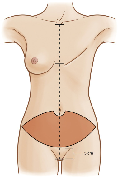 Markings are performed in the preoperative surgical area. The patient’s midline is marked from the sternal notch to the pubic tubercle, including horizontal midline marks at the inframammary fold ( Fig. 4.2 ). Our preoperative markings for all abdominal-based flaps are lower than the traditional DIEP flaps; we do not include the skin bridge immediately cephalad to the umbilicus. Instead we begin our incision half way at the level of and around the umbilicus. The caudal incision is approximately 5–6 cm above the pubis symphysis. The lower incision increases the chance of capturing the point when all the venae comitantes converge, thereby including the more lateral superficial circumflex iliac veins into the flap ( Fig. 4.3 ). This also allows us to visualize and effectively use the SIEA prior to it arborizing into smaller tributary arterioles. We mark this flap with this method in all abdominal-based breast reconstruction for this reason. Periumbilical perforators are preserved with careful technique.