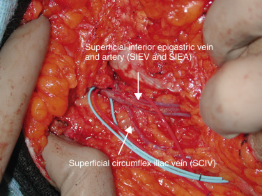 The SIEA often have two closely associated diminutive venous comitantes. These veins are small in caliber and are not often used. They may be used, however, if they are large enough compared to the superficial inferior epigastric vein (SIEV). The SIEV drains into the saphenofemoral bulb before meeting the femoral vein or into the greater saphenous vein as a tributary. Anastomotic ladder-like connections exist between this superficial system and perforating veins from the deep inferior epigastric veins (DIEVs). In the physiologic state, the SIEV has been shown to be the preferential drainage path of the abdominal pannus. In 40% of patients, medial and lateral branches of the SIEV drain variably into different vessels. Both branches, if present, need to be preserved and dissected for adequate venous drainage as many flaps lack overlapping venous territory drainage between branches. If a single venous anastomosis is preferred, functional testing for venous congestion is paramount.