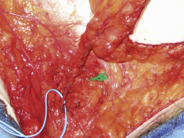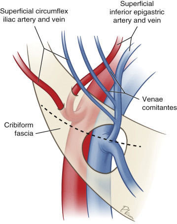 Dissection begins at the lower incision in the lateral to medial direction. This incision should be made judiciously, as in a thin patient the SIEV may lay superficial. Using loupe magnification dissection, the SCIA/SCIV is first encountered. The SCIV is included in the dissection to improve venous outflow whenever possible (see Fig. 4.3 ). The SIEA is next encountered at the midpoint of the inguinal ligament, generally deep to Scarpa’s fascia. We avoid circumferential dissection as this can lead to arterial spasm. The SIEV is identified in a more medial and superficial position in the subcutaneous tissue 2–3 cm medial to the SIEA at a point 4–5 cm lateral from the midline. All branches of the SIEV are included and followed. The vessels are followed for a few centimeters by having an assistant provide gentle cephalad retraction of the flap and superior retraction of the groin skin. The SIEA is dissected in the inferomedial direction until the fascial hiatus is encountered. Fully opening the hiatus at the cribriform fascia affords for maximal exposure ( Fig. 4.4 ).
