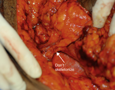 The SIEA and SIEV are dissected to the level of the first appearing lymph node. The lymph node, as noted by Buchel et al., is frequently where the artery and vein separate. Minimizing trauma to the lymphatic channel is key in this area to decrease seroma rates, commonly seen as high as 20% in SIEA flaps (3.4% in our series). However, if nodes are within the bundle, it is counterproductive to attempt to skeletonize and extract this node ( Fig. 4.5 ), as this leads to unnecessary risk, spasm, and possibly irreversible trauma. The artery at this level makes a sharp 90–150 degree turn toward the femoral artery.