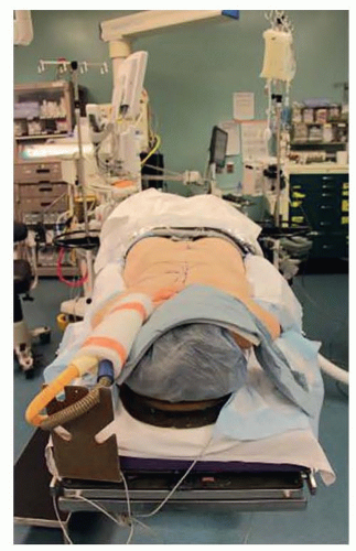 FIG 3 • Demonstrates positioning of the patient. The bed is turned 180 degrees so that the anesthetic machine is at the foot of the bed. The patient’s arms are tucked, the face is protected, and all bony prominences are well padded.