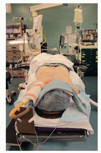 FIG 3 • Demonstrates positioning of the patient. The bed is turned 180 degrees so that the anesthetic machine is at the foot of the bed. The patient’s arms are tucked, the face is protected, and all bony prominences are well padded.