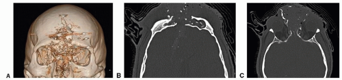 FIG 3 • A. 3D CT reconstruction demonstrating comminuted facial fractures with concomitant frontal sinus injury from the shotgun blast. B. Axial CT demonstrating massive injuries to the anterior and posterior tables of the frontal sinus with segmental bone loss. C. Axial CT image showing destruction of the frontonasal duct.