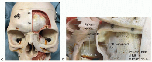 FIG 1 (Continued) • C. Supraorbital foramina (arrows) mark the lateral boundaries of the frontal sinus. The anterior table has been partially removed from the left half of the frontal sinus on this model. D. Anterior table of frontal sinus reflected.