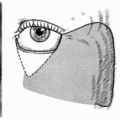 The frontotemporal flap consists of two parts: a horizontal superciliary, or carrier, flap and a temporal portion that represents the composite part of the flap used to replace the missing structures at the recipient site. The carrier flap can be cut as narrow as 5 mm in the cutaneous layer, but by beveling the incision on both sides, a subcutaneous flap width of approximately 10 mm is possible.