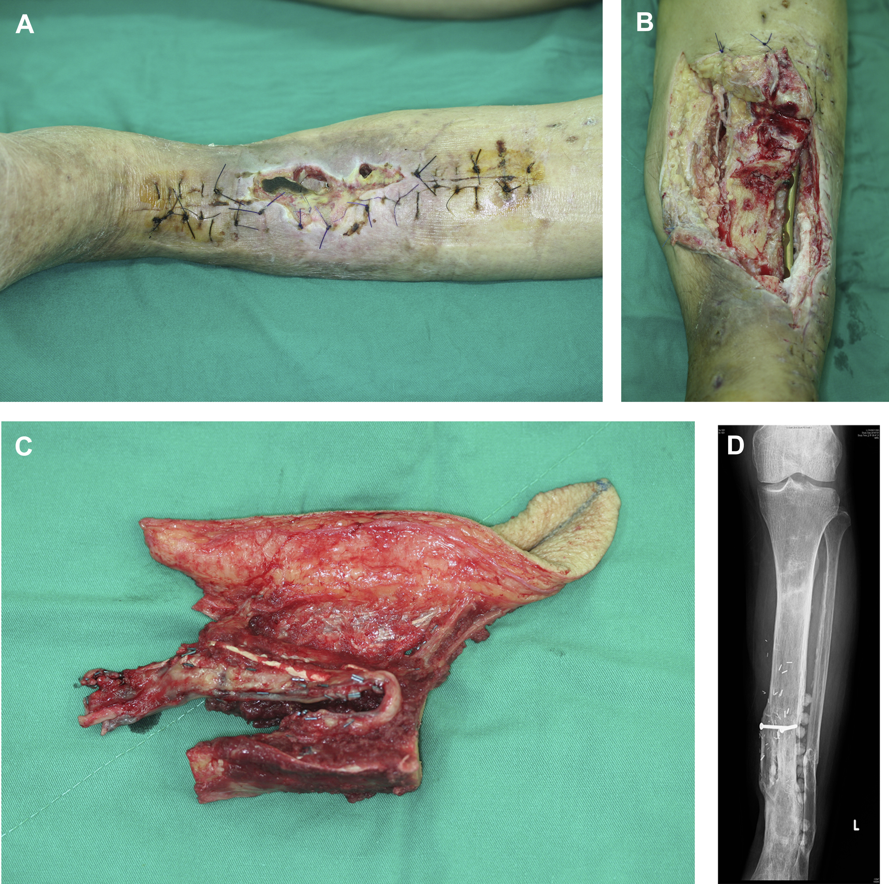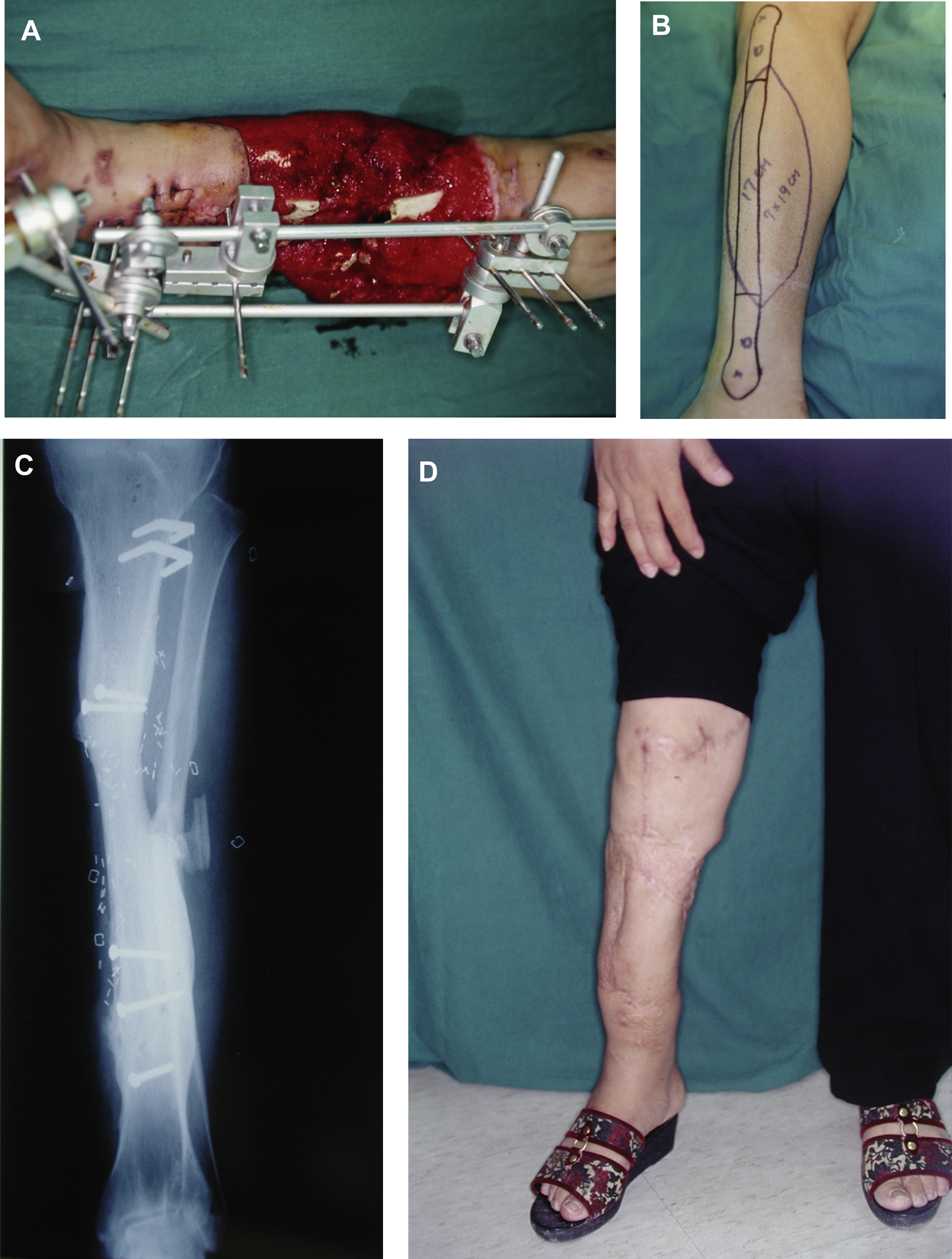 ( A ) This female patient in her 40s sustained right tibial open IIIB fracture with composite defect. ( B ) Fibular osteocutaneous flap. ( C ) Advanced bony hypertrophy. ( D ) Eight-year follow-up.