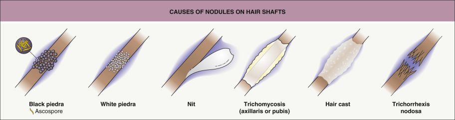 “Piedra” means “stone”, reflecting the fungal elements’ adherence to one another to form nodules along the hair shaft. Piedra is a superficial infection that begins under the cuticle of the hair and extends outward, which can lead to weakening and breakage of the hair. As the nodules enlarge, they can even envelope the hair shaft ( Fig. 77.1 ). The two major forms – black piedra and white piedra – are distinguished by their clinical appearance and findings on microscopic examination ( Table 77.4 ).