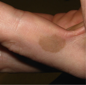 After a 10- to 15-day incubation period, tinea nigra most commonly presents as a single, sharply marginated, brown to gray–green macule or patch that can be velvety or have mild scale ( Fig. 77.2 ). There are usually no associated symptoms (i.e. pruritus), and no predisposing factors have been identified. Although most frequently seen on the palms, tinea nigra can also appear on the soles, neck, and trunk. Palmoplantar lesions are said to resemble acquired acral melanocytic nevi, but the former are usually larger, lighter in color, and lack the linear striations of acral nevi . The advancing border of a tinea nigra lesion may also be more darkly pigmented than its center. While the disease tends to be chronic, recurrence after effective treatment is infrequent except in the case of re-exposure.