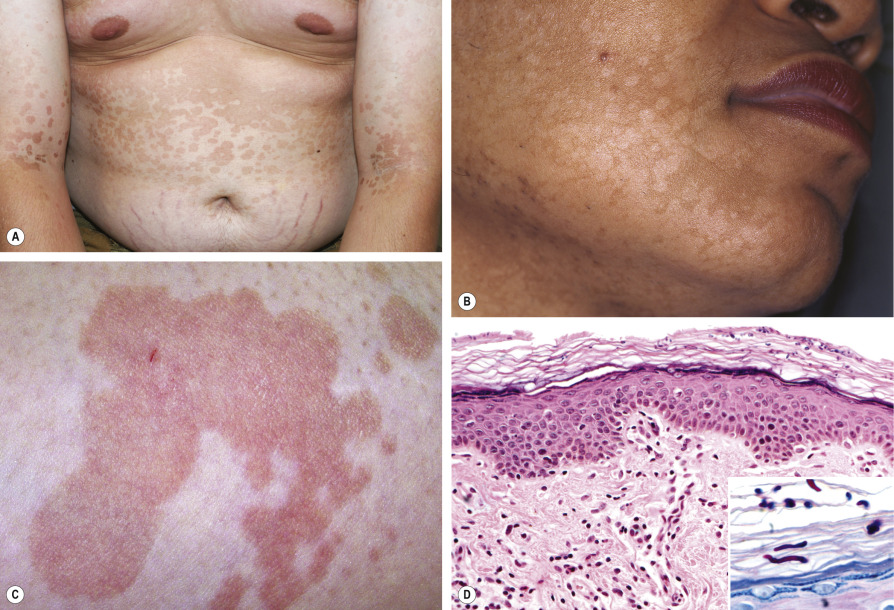 Patients usually present with multiple oval-to-round macules, patches or thin plaques with mild, fine scale. Demonstration of this associated scale may require scratching or stretching the skin surface. The lesions are often confluent centrally within areas of involvement, which may be extensive. Seborrheic regions, in particular the upper trunk and shoulders, are the favored sites. Less frequently, lesions are seen on the face (especially in children), scalp, antecubital fossae, submammary region, and groin. Involvement of flexural areas is sometimes referred to as “inverse” tinea versicolor.