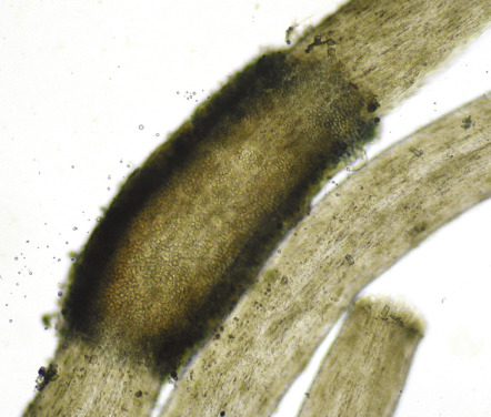 Biopsies of tinea versicolor and tinea nigra are usually not performed, as KOH examination of associated scale is typically diagnostic. In tinea versicolor, both hyphal and yeast forms are seen; although likened to “spaghetti and meatballs”, the findings more closely resemble “ziti and meatballs” ( Fig. 77.5A ). In tinea nigra, KOH examination reveals septate pigmented hyphae. When biopsy specimens are obtained, similar findings are observed within the stratum corneum ( Fig. 77.3D ). In KOH examination of expressed follicular contents or biopsy specimens of Malassezia (Pityrosporum) folliculitis, only yeast forms are seen. Cultures of H. werneckii first appear as pasty, green–black colonies with a yeast-like appearance, and after approximately 2 weeks become a fuzzy, dematiaceous (dark in color) mold. Culture of Malassezia is generally not required; if necessary, the plate must be overlaid with sterile oil because of the organism’s lipophilic nature.