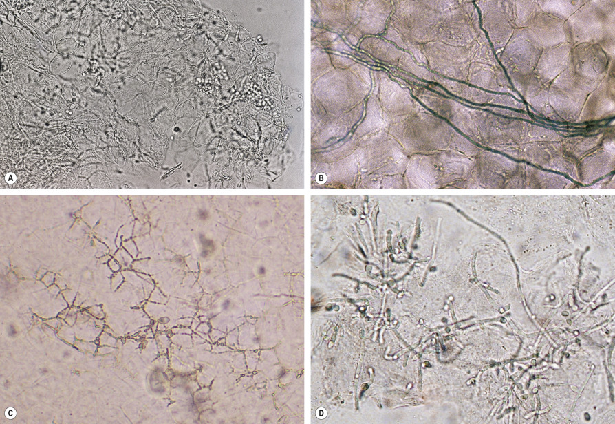 | KOH examination of “crush prep” of cut hair shafts | Non-dematiaceous hyphae with blastoconidia and arthroconidia | Dematiaceous hyphae with asci and ascospores † |
