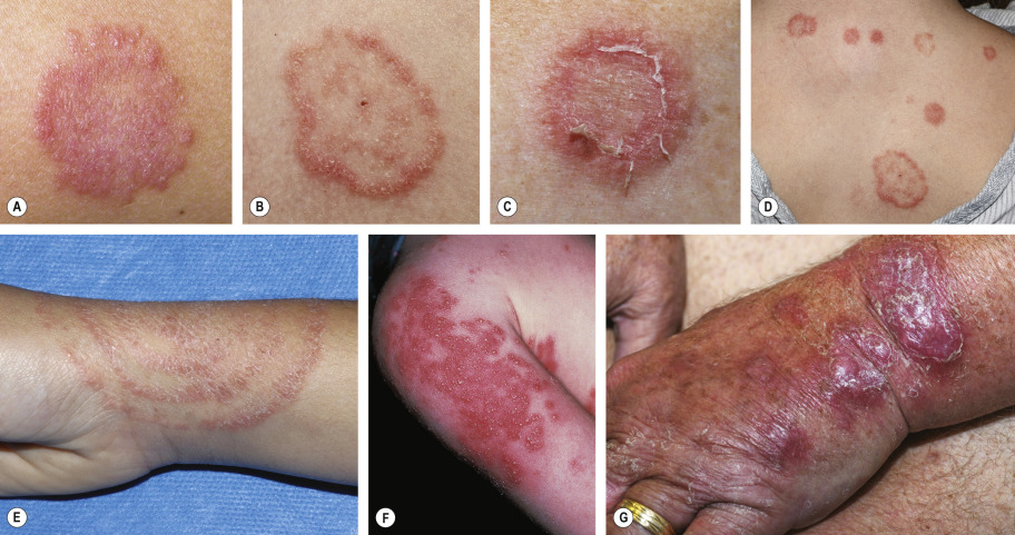 The typical incubation period is 1 to 3 weeks. Infection spreads centrifugally from the point of skin invasion with central clearing of the fungus, typically resulting in annular lesions of varying sizes ( Fig. 77.6A–D ). Arcuate, circinate, concentric, and oval lesions can also develop ( Fig. 77.6D–F ). Although scale is usually present, it may be lessened or absent if topical corticosteroids have been used (tinea “incognito”). Pustules within the active border are suggestive of tinea (see Fig. 77.6E ). Lesions are occasionally vesicular, granulomatous, or verrucous ( Fig. 77.6G ). Associated symptoms may include pruritus and burning.