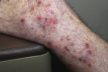 Tinea cruris is a dermatophyte infection of the inguinal region, in particular the inner aspects of the upper thighs ( Fig. 77.8 ) and crural folds, with occasional extension onto the abdomen and buttocks. The three most common causative agents are Epidermophyton floccosum , T. rubrum , and T. mentagrophytes ( Table 77.10 ).