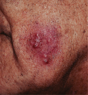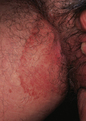 Since zoophilic organisms are the most common culprit and affected areas often have a large number of terminal hair follicles, the clinical presentation tends to be severe, with intense inflammation and multiple follicular pustules. Abscesses, sinus tracts, bacterial superinfection, and kerion-like boggy plaques can develop. Patients may have constitutional symptoms such as malaise as well as lymphadenopathy and even scarring alopecia. A second type of tinea barbae is superficial, less inflammatory, and similar to tinea corporis; T. rubrum is usually the causative agent in this variant ( Fig. 77.10 ). Alopecia may be present in the center of the lesion, but it is reversible. Other conditions that can mimic tinea barbae include bacterial folliculitis, viral infections (herpes simplex or zoster), acne vulgaris, cervicofacial actinomycosis, and a dental sinus tract. Spontaneous resolution may occur if all of the infected hairs fall out.