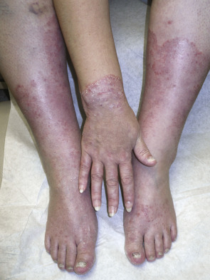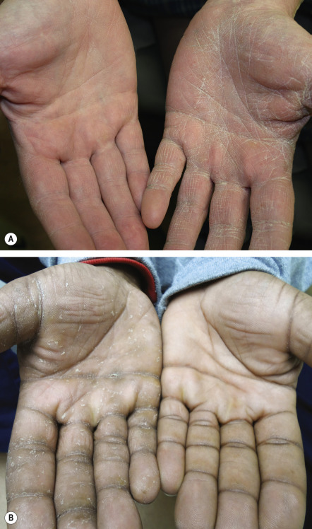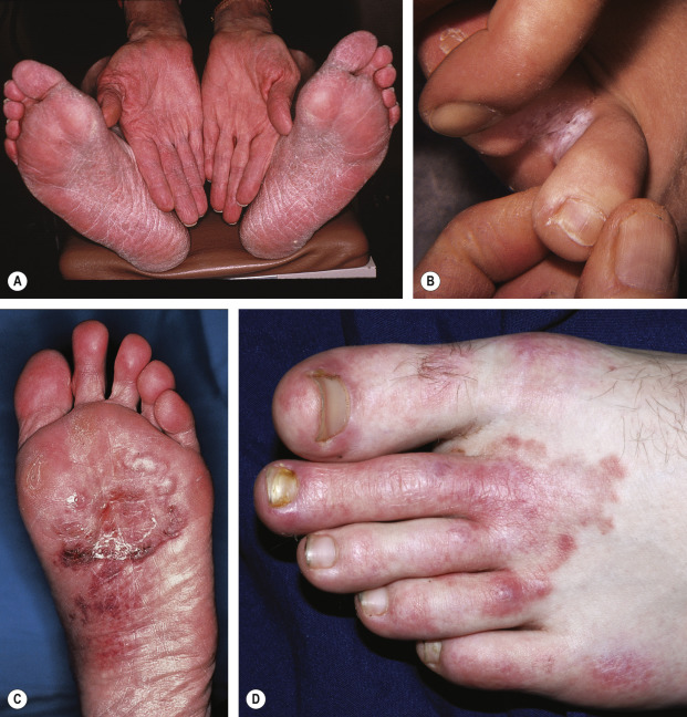Moccasin-type tinea pedis is often present in patients with tinea manuum, and the two share clinical features such as chronicity and hyperkeratosis. Tinea manuum is usually non-inflammatory and often unilateral (“two feet and one hand syndrome”) ( Fig. 77.9 ; see Fig. 77.15A ); there is hyperkeratosis of the palms and digits, including within creases, that fails to respond to emollients . Tinea unguium of the involved hand can serve as a clue to the diagnosis, but infection of all the fingernails is uncommon. Other presentations include exfoliative, vesicular, and papular variants. The differential diagnosis may include psoriasis, irritant or allergic contact dermatitis, dyshidrosis, and a “dermatophytid” reaction.