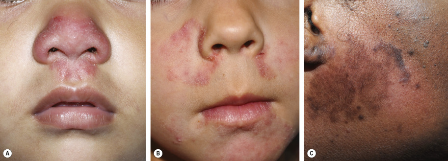 While some dermatophyte infections of the face have classic features, e.g. scale, annular configuration, pustules in the border, others can be more difficult to diagnose clinically and require a high index of suspicion ( Fig. 77.11 , Table 77.9 ).