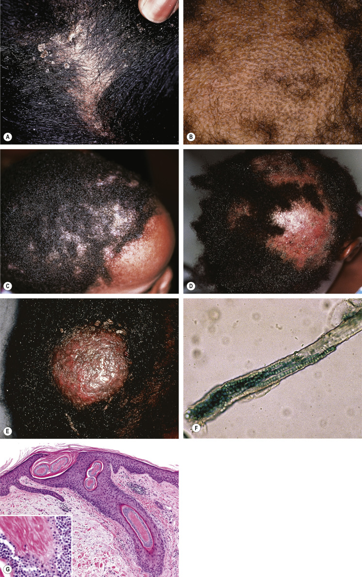 Different clinical presentations arise from the various causative organisms. For example, T. tonsurans causes an endothrix infection (see below), which classically results in “black dot” tinea capitis due to hair breakage near the scalp. In contrast, M. audouinii is an ectothrix form of tinea capitis that typically presents with dry, scaly patches of alopecia (“gray patch” tinea capitis). Both the pathogenicity of the culprit organism and the host immune response are factors that determine the severity of disease. Tinea capitis can range from non-inflammatory scaling that resembles seborrheic dermatitis (especially with T. tonsurans ; Fig. 77.12A ) to a severe pustular reaction with alopecia, known as a kerion. Alopecia with or without obvious scale is the most common presentation of tinea capitis ( Fig. 77.12B–D ). The alopecia may occur in discrete patches or involve the entire scalp. Use of dermoscopy can highlight “comma”, “corkscrew”, and dystrophic broken hairs that represent clues to the diagnosis of tinea capitis (see Ch. 69 ) . Many patients have posterior cervical and posterior auricular lymphadenopathy, which is helpful in differentiating tinea capitis from less inflammatory causes of alopecia, such as alopecia areata.