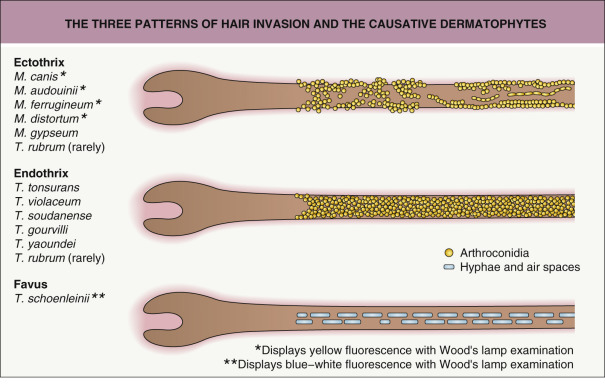 For those dermatophytes that invade hair, three patterns of invasion exist: endothrix, ectothrix, and favus ( Fig. 77.13 ):