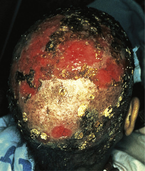 Scarring alopecia with erosions and several scutula on the occipital scalp. The latter represent masses of keratin plus fungi.