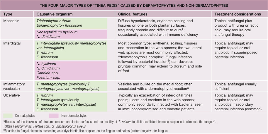 The dermatophytes that are typically responsible for tinea pedis are T. rubrum , T. interdigitale (previously T. mentagrophytes var. interdigitale), T. mentagrophytes , E. floccosum , and T. tonsurans (in children). Non-dermatophyte pathogens that produce clinical findings identical with tinea pedis include Neoscytalidium dimidiatum and N. hyalinum (moccasin and interdigital types) and, occasionally, Candida spp. (interdigital type). There are four major clinical types of tinea pedis, as outlined in Table 77.11 : moccasin ( Fig. 77.15A ), interdigital ( Fig. 77.15B ), inflammatory ( Fig. 77.15C ), and ulcerative. Each type has different associated morbidities and complications that can affect diagnostic considerations and therapeutic options. These include bacterial superinfection (the “dermatophytosis complex”), dermatophytid reactions, cellulitis (especially in patients who have venous hypertension, harvested saphenous veins, and chronic edema), and even osteomyelitis leading to amputation in diabetics. Other conditions that can mimic tinea pedis are listed in Table 77.9 . KOH examination and culture easily differentiate the moccasin and inflammatory forms of tinea pedis from these entities . Erythrasma can be diagnosed with Wood’s light examination because of its “coral red” fluorescence. Oral antifungal therapy should be considered in diabetics, immunocompromised patients, and those with moccasin-type tinea pedis. Finally, other dermatophyte infections often occur together with tinea pedis – in particular, tinea cruris, onychomycosis, and tinea manuum – and these sites should be examined ( Fig. 77.16 ).