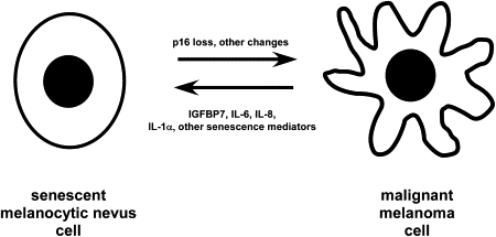 A recent set of studies has defined a set of novel determinants of oncogene-induced senescence that may represent opportunities for future intervention against malignant melanoma. Screening of BRAF V600E -expressing melanocytes led to the identification of insulinlike growth factor binding protein 7 (IGFBP7) as a determinant of oncogene-induced senescence in human melanocytes. In this study, administration of IGFBP7 to mice xenografted with BRAF V600E human melanoma cells induced a significant regression of these tumors. In another study, expression of interleukin (IL)-6 along with associated cytokines IL-8 and IL-1α were found to mediate an oncogene-induced senescence response. A third report implicated expression of the chemokine receptor CXCR2, which binds IL-8 along with other cytokines, for reinforcing cellular senescence responses. As summarized in Fig. 1 , the use of these and other mediators of senescence that have yet to be characterized may be useful in the future for reverting melanoma cells in patients toward a senescentlike state. Although this strategy may not cure melanoma, administration of soluble proteins and cytokines that have the potential for inducing a state of dormancy could be important for achieving long-term control of this malignancy in patients with advanced disease.