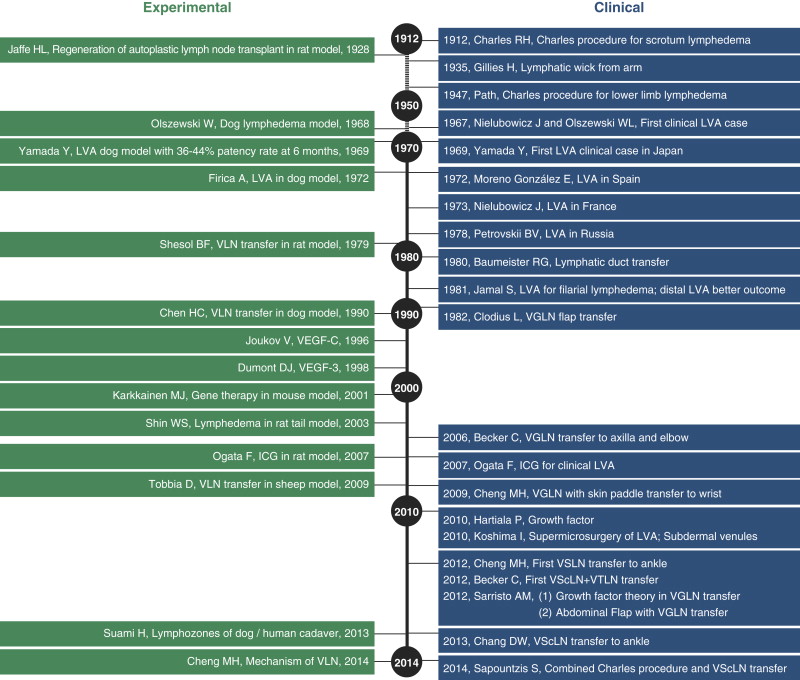 The surgical and microsurgical treatment of lymphedema is rapidly evolving with new techniques, improved outcomes reporting, and descriptions of more effective treatment strategies. Moving forward within the specialty, a thorough understanding of previous developmental milestones related to anatomy, basic science research, diagnosis, and multimodal treatment will help to refine future development pathways. There are 210 publications relating to lymphedema from 2003 to 2013 queried on PubMed as of April 20, 2014, including 35 on lymphovenous anastomosis (LVA), 26 on physiotherapy, 23 on risks/causes, 20 on quality of life, 15 on vascularized lymph node (VLN) transfer, 14 indocyanine green (ICG) studies, and 13 on diagnosis, among others. The milestones for the development of lymphedema research and the significant reported clinical experiences in the surgical treatment and microsurgical approaches are comprehensively described in the previous chapters and summarized in Figure 24.1 . Rapid recent research interests and clinical inquiry are notable along the timeline of events. In addition, the circulation of normal lymphatic fluid with the available principles of lymphedema surgery is briefly outlined in Figure 24.2 . These surgical approaches can be categorized into two groups: